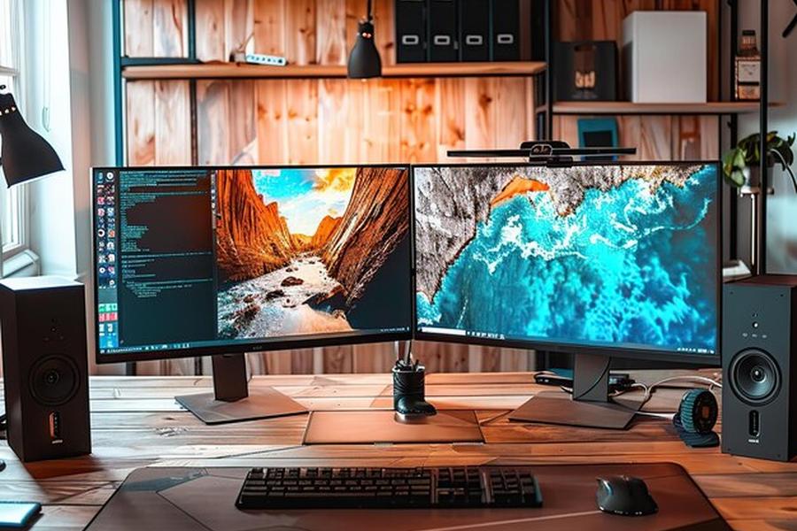 Poste de travail avec deux écrans affichant des paysages nets pour faciliter les comparatifs carte graphique.